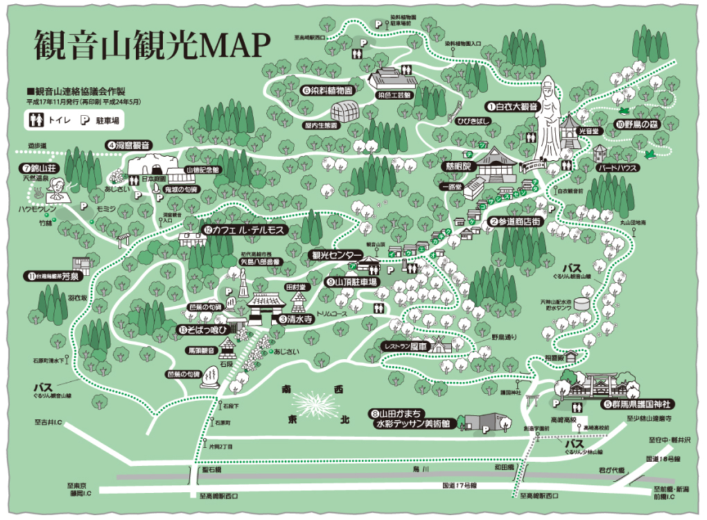 高崎駅の西口8番バス乗り場で、ぐるりん観音山行「系統番号14」に乗り、バスが国道17号線を横切ると、眼前に観音山丘陵が展開します。「観音山」は、白衣大観音、清水寺などの社寺と、染料植物園、野鳥の森などがあり、総合レクリェーションゾーンとなっています。